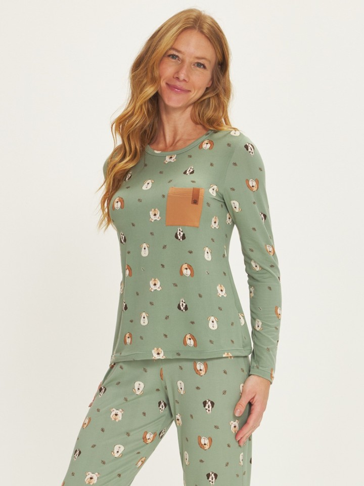 Pijama todo estampado composto por uma blusa de manga longa com decote redondo, confeccionado na malha Peach Touch, essa malha vai lhe surpreender, pois parece que você esta tocando em uma pele de pêssego. Calça toda estampada com cintura de elástico. Um clássico, ideal para qualquer momento!
