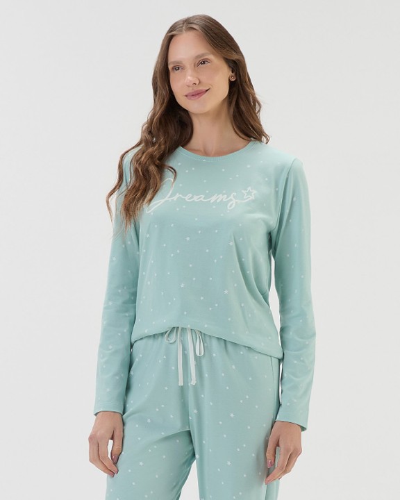Pijama feminino de manga longa com calça, confeccionado em malha comfort macia e leve, garantindo aconchego e liberdade de movimento para noites de descanso. O conjunto apresenta fundo azul-claro com estampa rotativa de mini estrelas em tom off-white, criando um visual delicado e acolhedor.