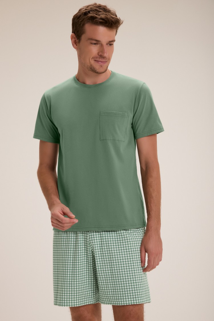 Pijama masculino manga curta com bermuda, feito em malha comfort para garantir máximo conforto durante o descanso. A camiseta conta com um bolso discreto, adicionando um toque de estilo sem perder a praticidade. Ideal para quem busca um conjunto leve e confortável para relaxar com qualidade.